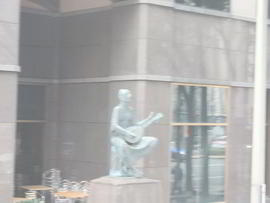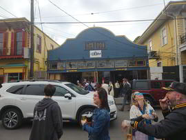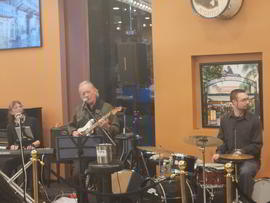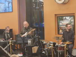 The parade can be seen out the open door of the cafe. That is probably why all the musicians are looking out the door.